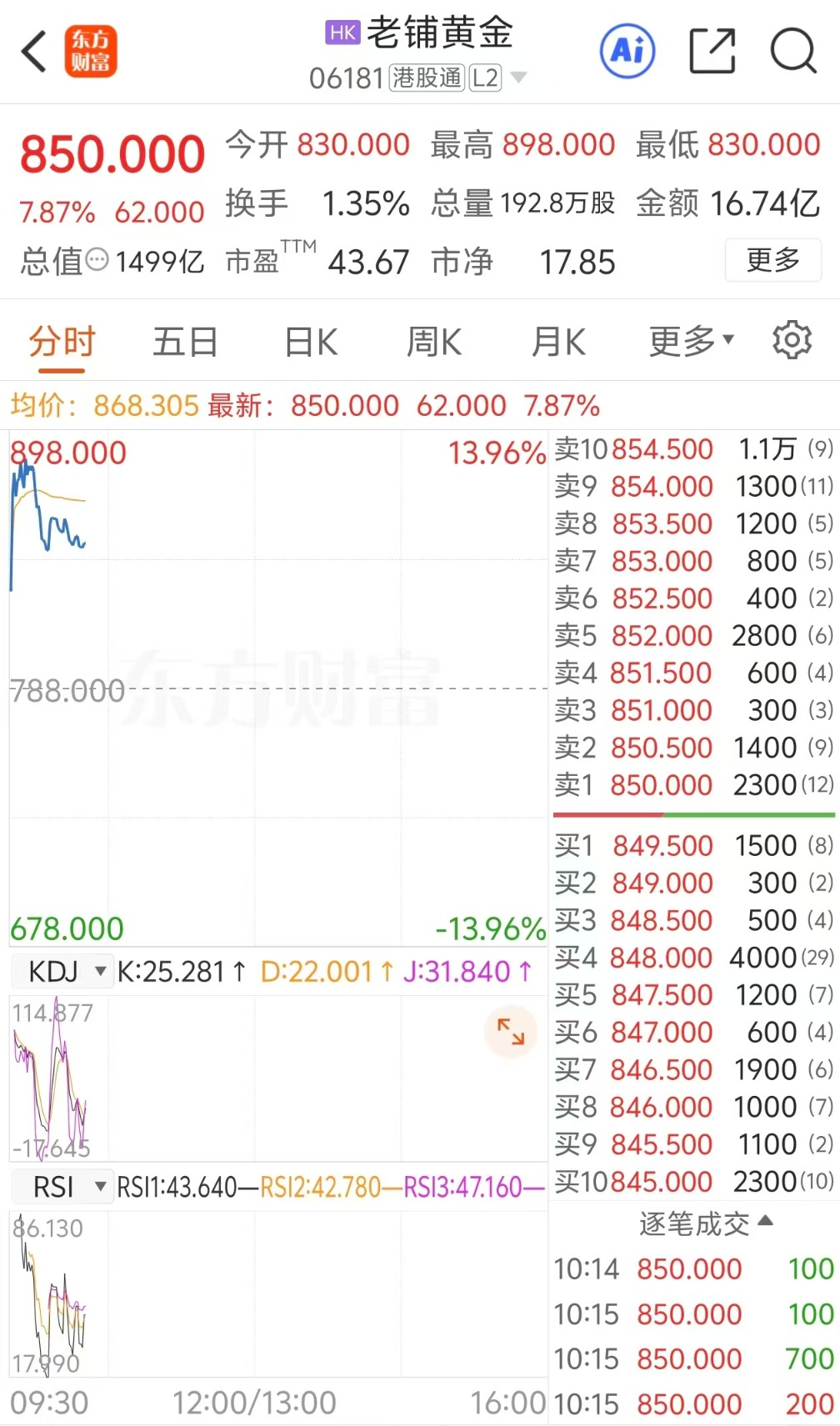 上证报中国证券网讯1月26日,老铺黄金盘中一度涨近14%。甩掉10时15分,该股涨幅回落至7.87%,报850港元/股。
