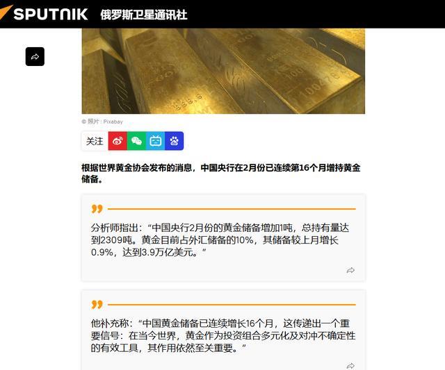 数据深切,罢休到2月份中国央行的黄金储备增多1吨,总抓有量达到2309吨。黄金现时占外汇储备的10%,其储备较上月增长0.9%,达到3.9万亿好意思元。