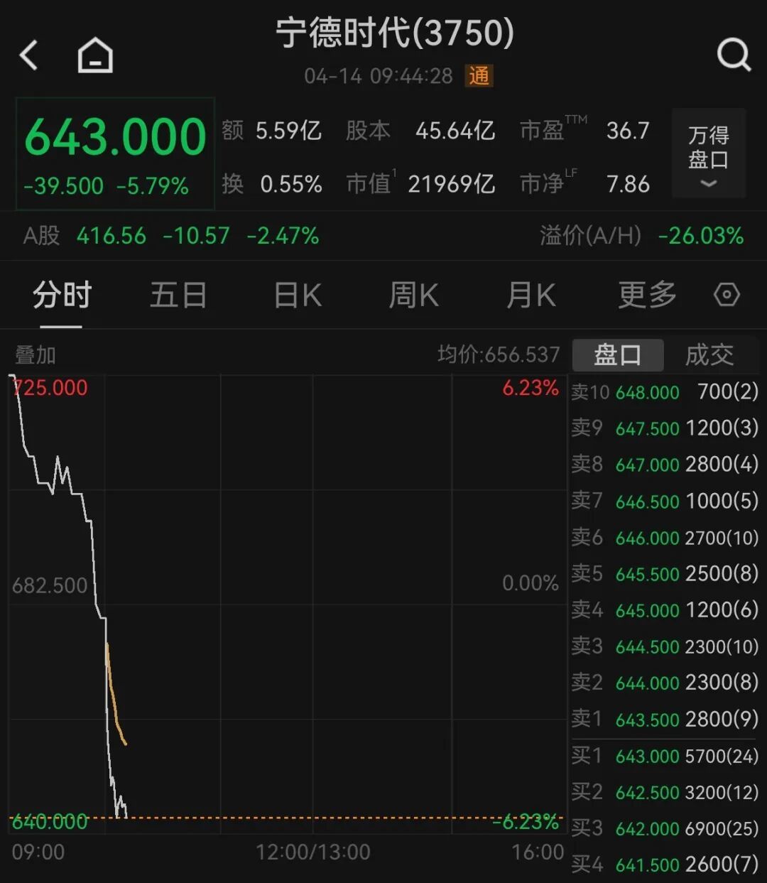 4月14日,宁德时期港股盘初合手续下挫开yun体育网,放荡发稿跌幅达5.79%,报643.00港元。