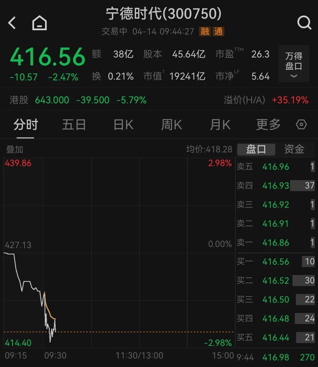 A股方面,宁德时期现跌2.47%,报416.56元/股,成交额达38亿元。
